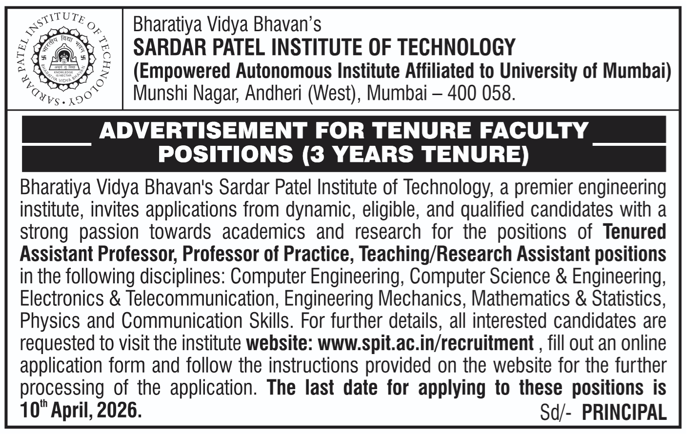 Bharatiya Vidya Bhavans Sardar Patel Institute of Technology Munshi Nagar, Andheri (West), Mumbai 400 058